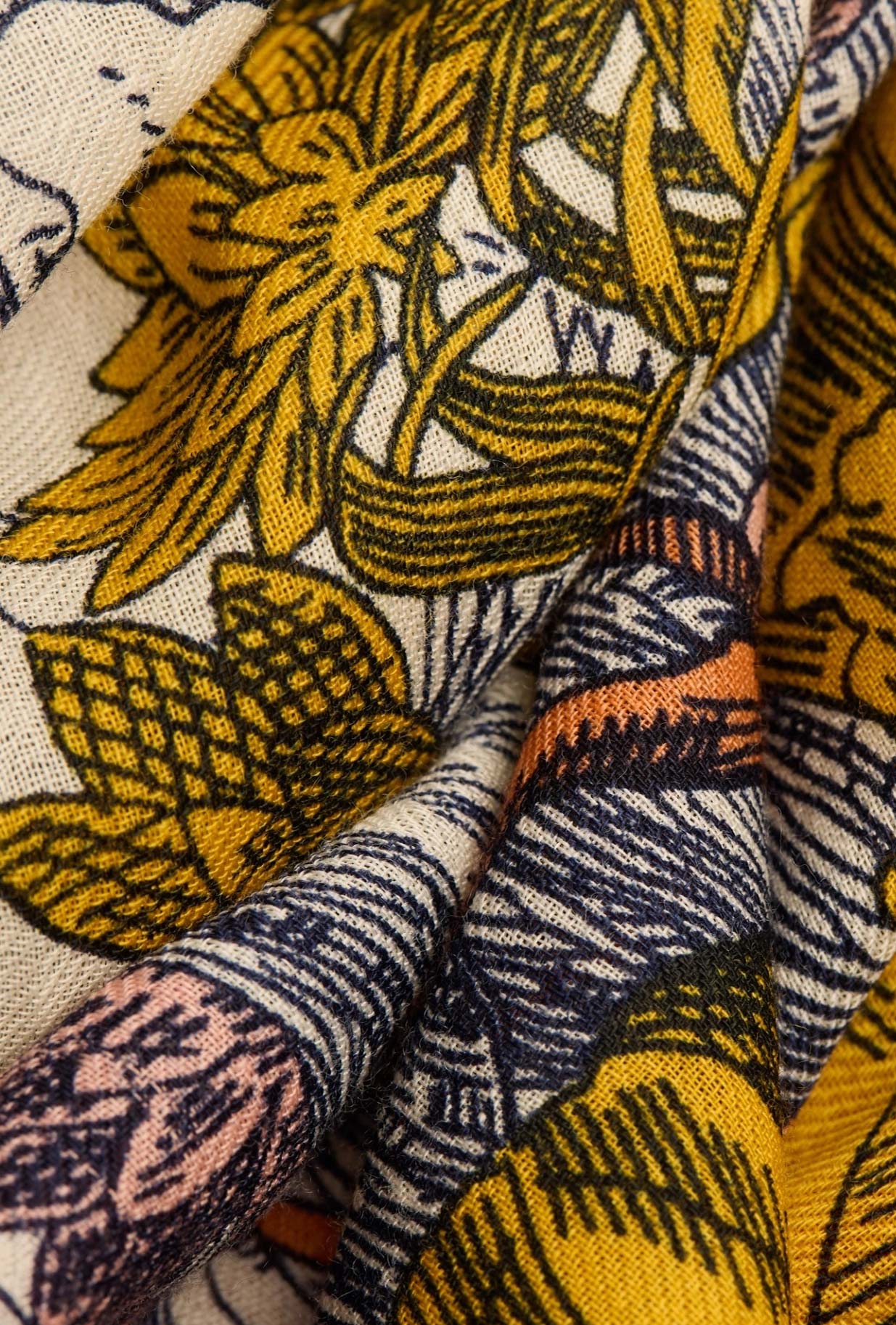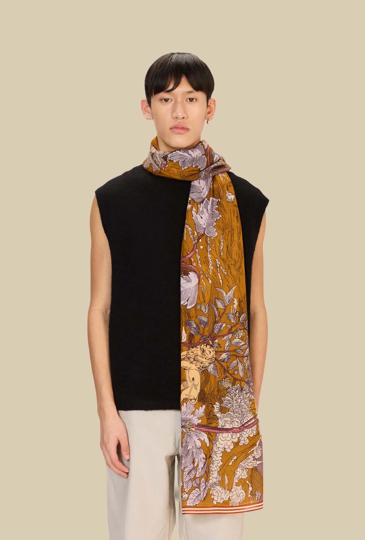 L’iconico scenario della savana si intreccia con la magia animalier: leoni e ghepardi, tra alberi e distese aperte, emergono come protagonisti di un mondo sospeso tra realtà e sogno, in un gioco armonioso di cromie calde e avvolgenti. Realizzata nel formato 70x190cm in leggerissimo Twill di Pura Lana, la sciarpa Historie, firmata Inoui Editions, ti accompagnerà in qualsiasi occasione, da quelle più eleganti a quelle casual-chic, aggiungendo un twist raffinato e sognante.