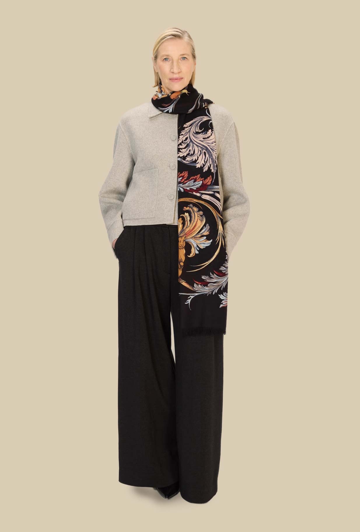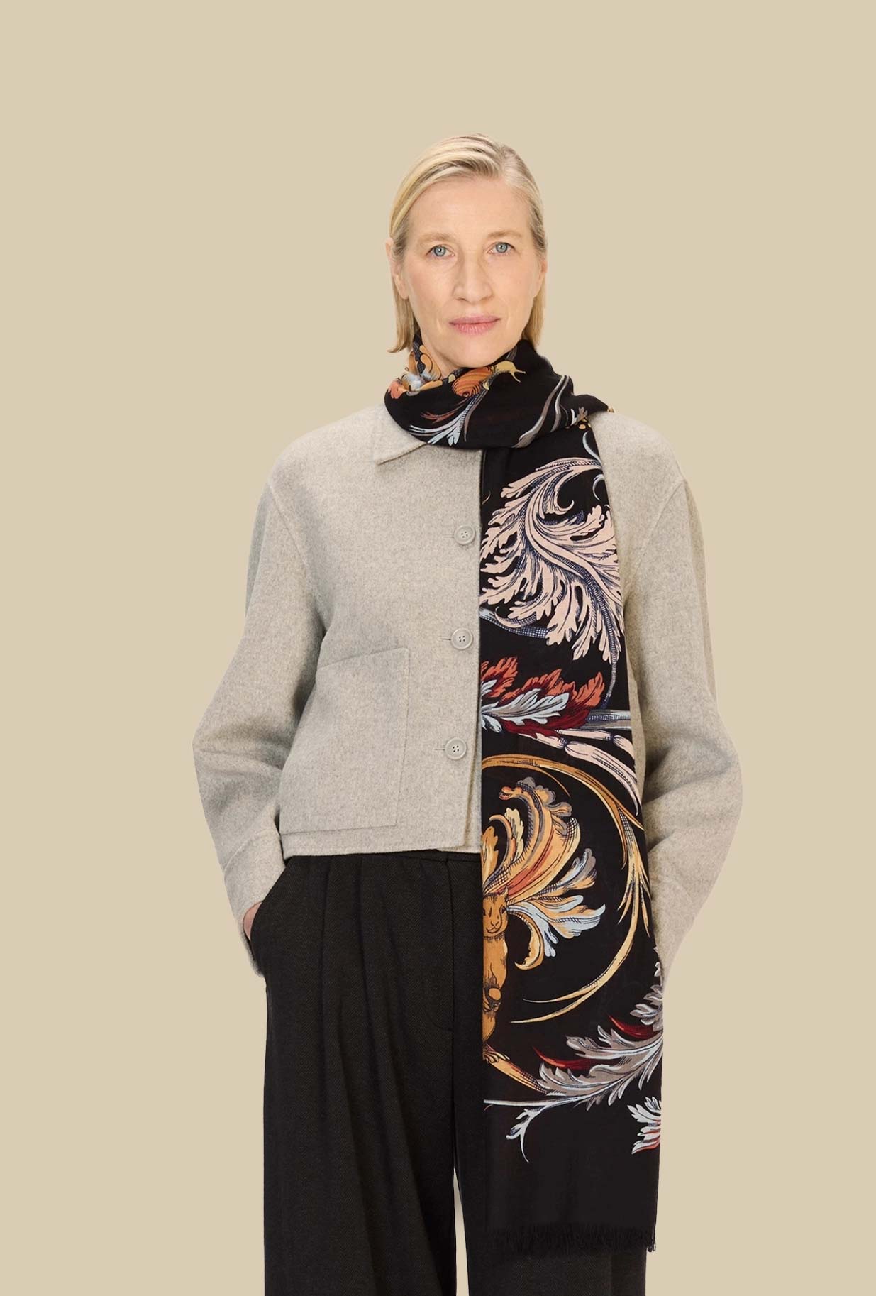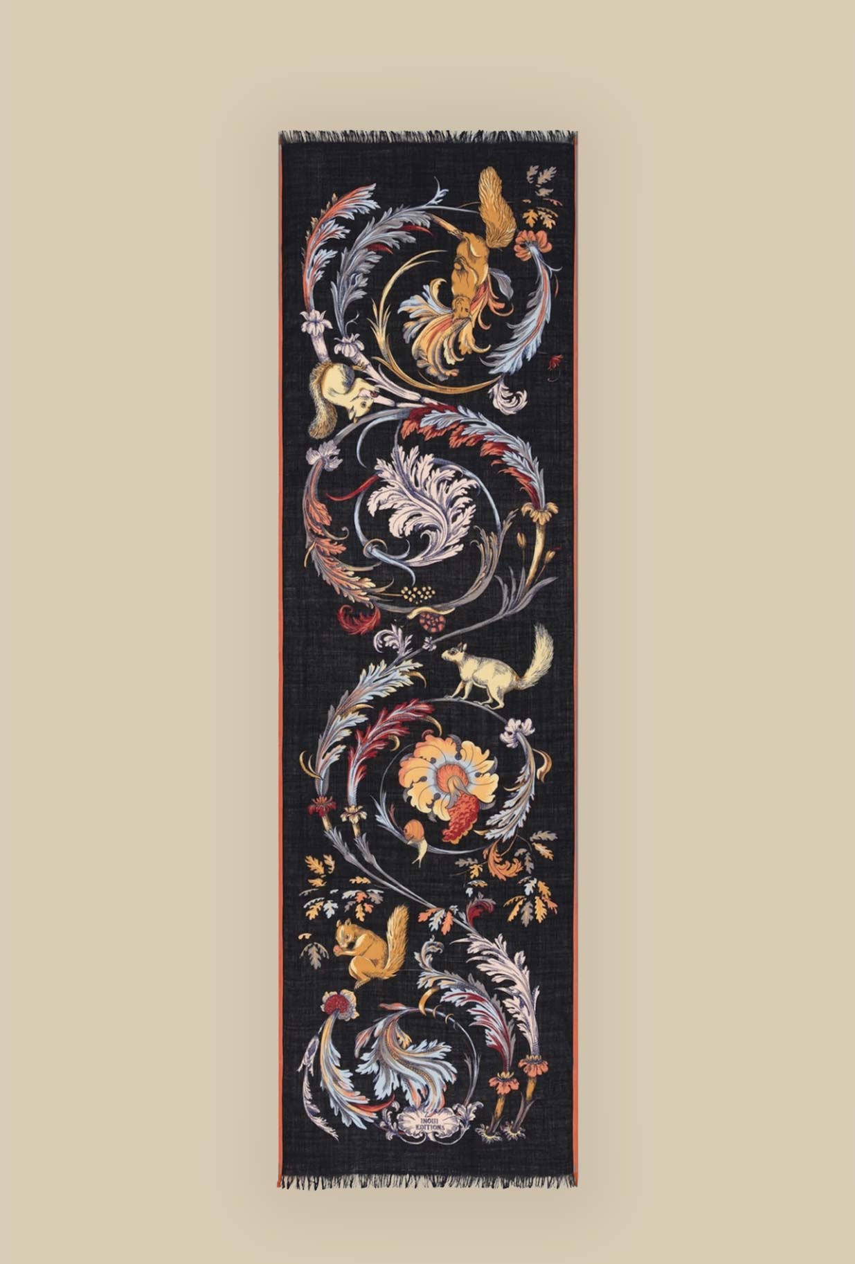 Esplora il magico mondo dell’eclettismo con la nuova sciarpa Rococò di Inoui Editions nella nuance Navy. Un viaggio meraviglioso attraverso il magico mondo bucolico del bosco, piccoli animaletti magici rivivono in cromie vibranti, mentre il foliage autunnale prende le forme di antiche architetture Rococò. Realizzata in un leggerissimo twill di pura lana, questa sciarpa stampata garantisce comfort e calore nelle giornate più fredde. Vivace e creativa, la sciarpe perfetta per ravvivare i look nel periodo invernale.