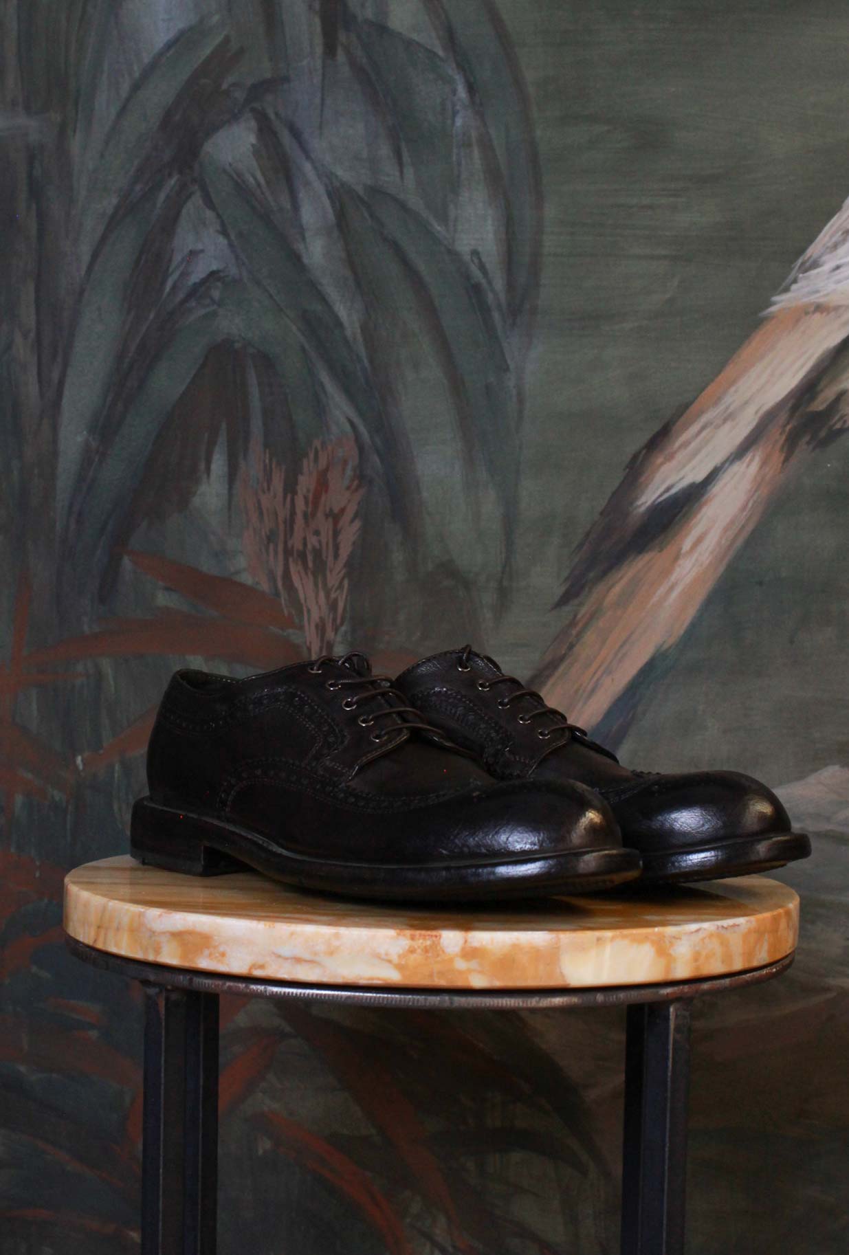 Raffinate e perfette, da sfoggiare in qualsiasi occasione, le nuove scarpe Derby di Lemargo presentano una silhouette intramontabile. L’eleganza timeless è impreziosita dalla pregiata lavorazione brogues elevata dall’emblematica Anticatura Manuale nella tonalità Verde Loden. Realizzate nel pregiato pellame Ranch, presentano una punta a mandorla arrotondata, lacci sottili cerati e l’iconica suola in cuoio e gomma antiscivolo personalizzata con la "schienetta", simbolo distintivo di Lemargo.