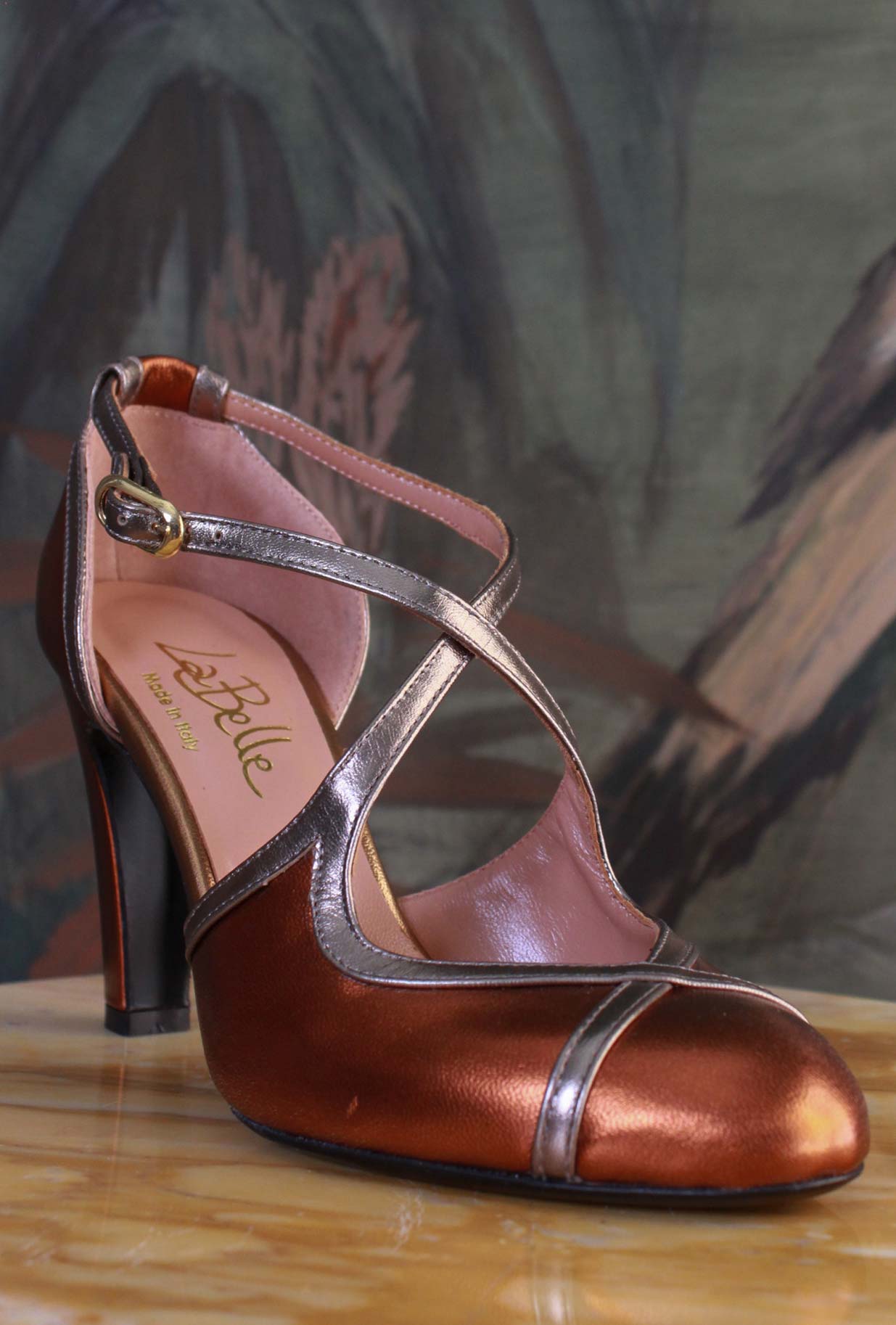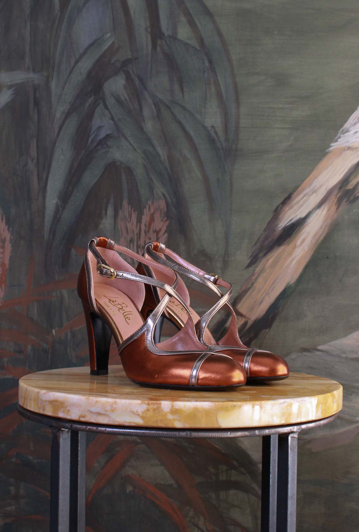 Un'icona senza tempo, la Maison "La Belle" rinnova l’emblematico modello Retrò in una variante esclusiva. La pregiata Pelle Metallizzata Rust incrocia dettagli scintillanti Bronce. Versatilità e sofisticazione, la nuova Décolleté Retrò saprà aggiungere stile e grinta ai tuoi look più eclettici e ricercati. Il tacco alto 8cm garantisce comfort alla calzata e slancia la Shilhouette della gamba sottolineando la femminilità con un tocco seducente e scintillante.